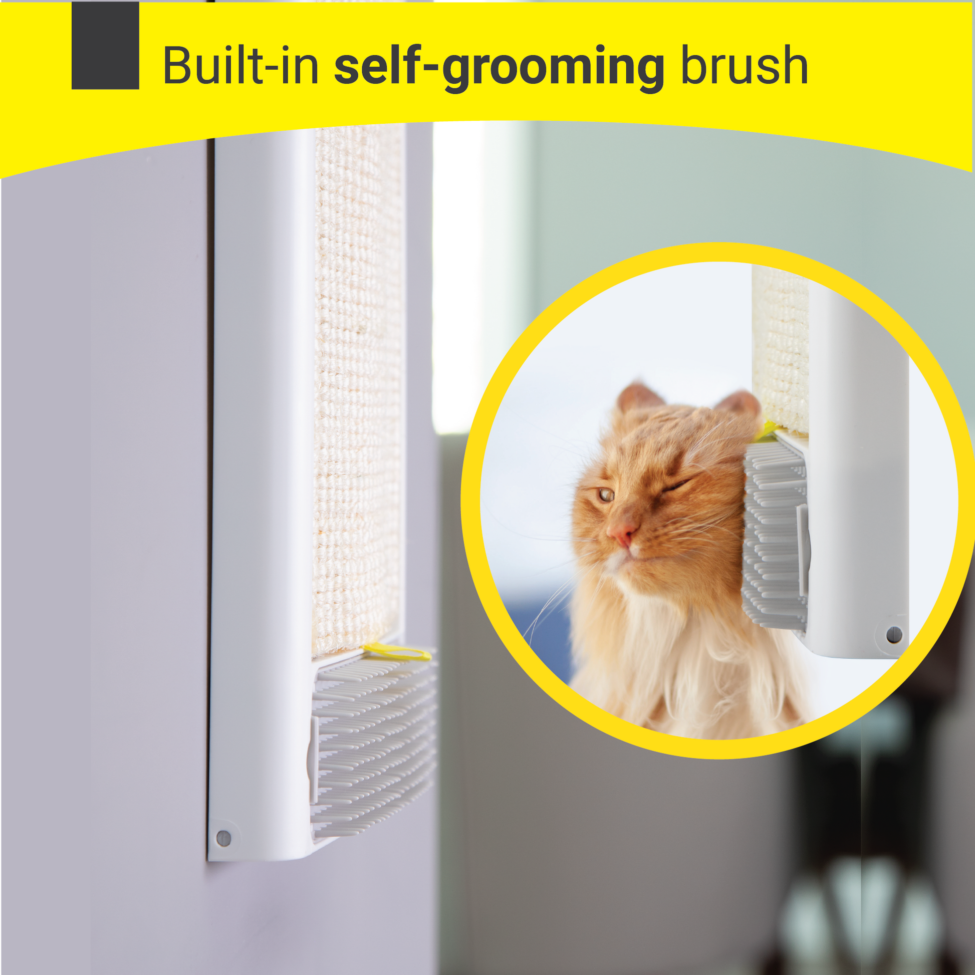 Cats love to scratch things and self groom. Set up this scratching post with a built-in self-grooming brush to keep your cat happy! The self-grooming reduces excess shedding. When your kitties massage themselves on the built-in brush, it stimualtes natural oil production for a shiney coat and for leaving their scent for other cats.